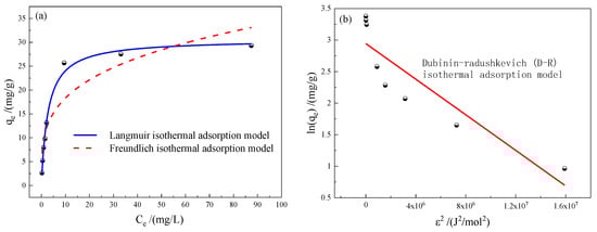 Isothermal adsorption experiment—a series of 100 mL solutions of different concentrations (10–100 mg/L) of Sb(III) were used to carry out the isotherm adsorption test under optimal conditions, with the concentration of Sb(III) measured in the solution after reaching adsorption equilibrium, and the adsorption equilibrium (qe) was determined. Langmuir [], Freundlich [] and Dubinin–Radushkevich (D–R) [] isotherm adsorption models [Equations (1)–(4)] were used to fit test results.
