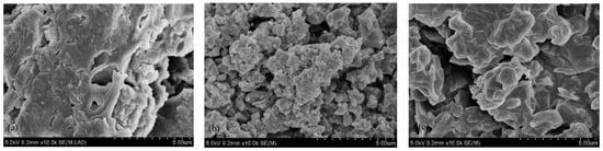 In Figure 3, the scanning electron microscopy of the topography of FMPAs before and after adsorption of Sb(III) is shown. It is clear in Figure 3a that the surface of FMPAs before modification was smooth and the voids are much less apparent. After the modification by Fe(III), the surface of the FMPAs has become uneven, and bonding processes provide more adsorption sites, with the structure of cracks, pores and holes increasing significantly in Figure 3b, providing more contact area for adsorption []. After adsorption of Sb(III), the voids decrease significantly, surface edges are blurred, as shown in Figure 3c. We used EDS to perform energy spectrum analysis on FMPAs. The composition of FMPAs before modification and FMPAs after modification and after the adsorption of Sb(III) are shown in Table 7. After modification by Fe(III), the contents of Na, K, S and other elements in FMPAs are lower, while the content of Fe increased to 10.8%, suggesting that the ion exchange reaction between Na, K, S and Fe(III) occurred during the modification process [], while Fe had been loaded onto the surface of the adsorbent. After the adsorption of Sb(III), the Fe element content decreased on the surface of the FMPAs, and the Sb content increased from 0% to 0.81%, and Sb(III) is adsorbed to the FMPAs, which is consistent with studies elsewhere [].