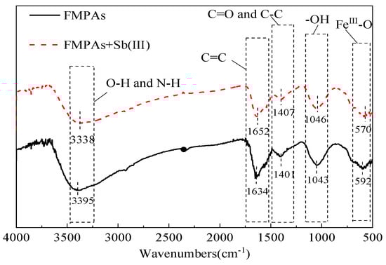 It can be seen from Figure 4 that the surface of FMPAs is rich in a variety of organic functional groups. The wave number 3395 cm−1 before adsorption in the figure represents the overlapping area of O-H and N-H functional groups []. The absorption peak of FMPAs after adsorption of Sb(III) has shifted significantly from 3395 to 3338 cm−1. The absorption peak of hydroxyl (–OH) shifted from 1043 to 1046 cm−1 after adsorption, which indicates that the O-H and N-H of the polysaccharide component contained in EPS in FMPAs played a greater role in the adsorption of Sb(III). This may be mainly through complexation [,], as the wave number before adsorption 1401 cm−1 represents the C=O stretching vibration and the skeleton vibration of the C-C bond [,], the vibration peak after adsorption of Sb(III) was 1401 cm−1, and the small range shift to 1407 cm−1 indicated that the adsorption process of the C=O bond and C-C single bond to Sb(III) was less likely. The absorption vibration peak of the C=C double bond was represented by the wave number of 1634 cm−1 [], and after the adsorption of Sb(III), the vibration peak shifted to 1652 cm−1, indicating that the C=C double bond played a greater role in the adsorption of Sb(III) by FMPAs. The wavenumber 592 cm−1 represents the low-frequency FeIII–O vibration peak []. After FMPAs adsorbed Sb(III), the vibration peaks were shifted to 570 cm−1. The reason for the deviation may be the increase of cation vacancies in the sample molecule, as Sb(III) occupies the position which originally belonged to Fe(III), and new valence bonds are formed with surrounding atoms. In addition, P=O, S=O, P–O, Si–O and other groups have strong absorption peaks at 1400–800 cm−1, which can provide information about phosphoric acid groups and sulphur-containing groups []. Combined with the element content before modification (Table 6), it can be seen that there were P=O and S=O groups in the adsorbent before modification, and the P, S, and O element contents after modification and adsorption were all reduced. The P=O and S=O groups have ion exchanged with Fe3+, and may have played a role in the adsorption of Sb [].