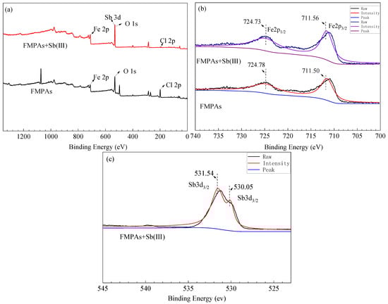 In Figure 5a, the scan spectra of XPS before and after adsorption by FMPAs are shown. It can be seen from Figure 5a that the main components in FMPAs were O, Fe and Cl, which were consistent with the EDS analysis (Table 6). Research [] showed that Fe exists in the form of FeOOH and Fe2O3 near the binding energies of 711 and 724 eV, respectively. However, FMPAs have obvious diffraction peaks at the binding energies of 711.50 and 724.78 eV (Figure 5b). After modification by Fe(III), Fe in FMPAs mainly exists in the form of FeOOH and Fe2O3 [], and FeOOH and Fe2O3 have a good effect on adsorption Sb(III) [], so FMPA modification by Fe(III) can promote its effect on the adsorption of Sb(III). After FMPAs adsorbed Sb(III), the binding energies corresponding to the Fe diffraction peaks became 711.56 and 724.73 eV, respectively (Figure 5b). This implies that Sb(III) replaced the –OH in FMPAs and combined with –O–Fe became an Fe–O–Sb coordination compound [,], facilitating Sb(III) adsorption. In addition, after adsorption of Sb(III), there were peaks at binding energies of 531.5 and 530.05 eV. These two peaks correspond to Sb(V) and Sb(III), and it showed that Sb(III) was partially oxidized to Sb(V) during the adsorption process. Because Fe3O4 iron may exist in FMPAs, it was speculated that there was a process of Fe(III) reduction to Fe2+ during the oxidation process of Sb(III). At the same time, XRD was used to analyse the powders which belong to FMPAS after adsorption of Sb(III). There were no obvious characteristic peaks before and after adsorption of Sb(III). The conclusion that there is an extremely weak diffraction peak was consistent with other work []. The reason may be that there are few crystalline substances produced during the Fe(III) modification process, but the biomass background of the adsorbent will interfere with the signals of these crystalline substances, and substances also affect the crystallinity of crystalline substances.