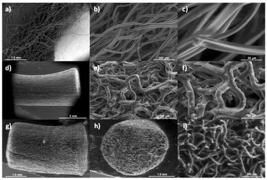The morphology of CBs before the carbonization process is presented in Figure 1a–c. Raw material consisted of a set of Y-shape cellulose acetate fibers interwoven in an axial direction with an average thickness of 25 µm. After the carbonization process, the filter volume was drastically reduced up to 35 folds but its monolithic shape was maintained as illustrated in Figure 1d,g,h, indicating that the heating program to produce the activated carbon was optimal. The conservation of a monolithic shape is not a common characteristic, as found in previous studies using CBs [4,7,9,10]. In this sense, other experiments show that an increase in the heating rate or operation temperatures produced a complete melting of the fibers. On the other hand, the fibers suffered a visible morphological change (see Figure 1e,f), as it switched from a Y-type fiber to a cylindrical fiber with an average diameter of 13 µm. This transition can be due to the polymerization of the cellulose chains to a more stable configuration due to the high calcination temperature. Finally, the overall yield for the activated carbon production was 11% due to the weight of the filters used as raw material.