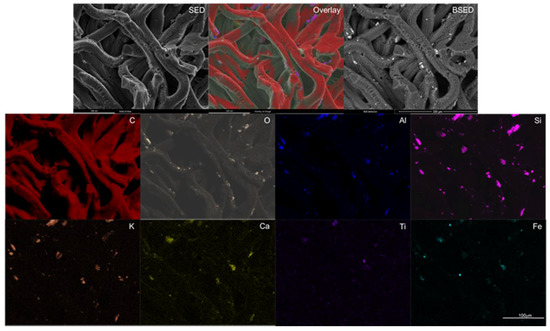 The surface and morphology of the particles were observed in an ESEM, i.e., model Quanta 250, FEI, Brno, Czech Republic. To show the distribution of chemical elements on the surface, an energy dispersive spectroscopy (EDS) elemental mapping was performed using an EDAX microprobe, model Octane Plus, NJ, USA.