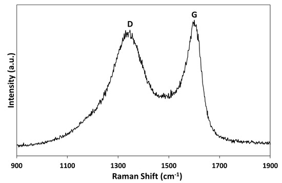 The concentrations of the acidic and basic sites obtained by Bohem’s method were 0.052 and 0.492 meq g−1, respectively. Thus, the surface of the activated carbon was basic, and this result is confirmed by the fact that the value of pHPZC was 9.02. Finally, Figure 4 show the Raman spectra obtained for activated carbon, as seen in two well-defined peaks observed at 1336 cm−1 and 1585 cm−1, which can be assigned to defective band (D band) and graphitic band (G band), respectively. Moreover, the large estimated ID/IG value (0.92) confirms the rich structure nature of the material, similarly to that reported for other hierarchically ordered carbon materials.
