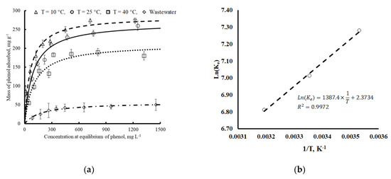 Adsorption isotherms of phenol on activated carbon as a function of temperature and type of water: (a) effect of the temperature and type of water; (b) Van ’t Hoff plot.