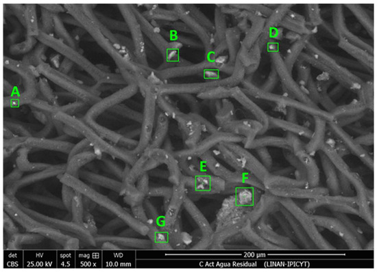 Figure 5a also presents the phenol adsorption isotherm obtained with wastewater at 25 °C and pH 7. The results indicate that the adsorption capacity of the activated carbon is drastically reduced with this type of water, reaching a maximum value of 56 mg g−1, showing an approximate reduction of 80% compared with the adsorption capacity obtained using ultrapure water. A physicochemical analysis of the water revealed a high presence of metal ions, which can block the pores of the adsorbent, preventing the diffusion of phenol towards the active sites. Similarly, the presence of organic matter contributes to a decrease in the adsorption capacity of activated carbons as reported in the literature [37]. Hence, the adsorption capacity of the material was reduced using wastewater. Figure 6 displays a micrograph of activated carbon exposed to wastewater. The micrograph shows a large number of crystals deposited on the surface of the adsorbent. Additionally, the EDS analysis confirmed the presence of some species such as Al, C, Ca, Cl, Fe, K, Mg, Na, O, P S, Si, and Ti.