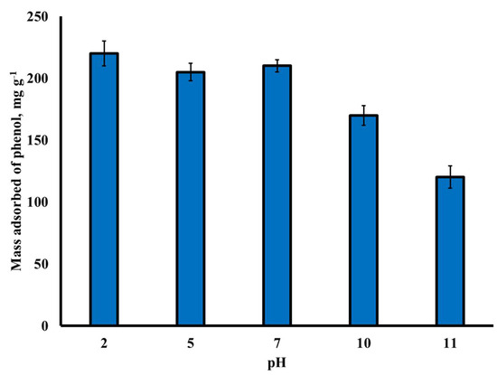 The solution pH is one of the most relevant factors in the study of adsorption processes since it directly affects the surface charge of the material and the speciation of the solute. To evaluate this effect, the adsorption capacities were obtained at pH 2, 5, 7, 10, and 11. The results are illustrated in Figure 7, where it can be observed that the adsorption capacity remained almost constant (q ≈ 215 mg g−1) in a pH range between 2 and 7, but it decreased linearly when the pH increased from 7 to 11. Thus, the adsorption capacity decreased by 43%, thereby increasing the pH of the solution from 7 to 11. These results are explained by considering that the activated carbon presented a pHPZC = 9.02, so that when the solution pH > pHPZC, the surface of the material is negatively charged. Thus, considering that the pKa value of phenol is 9.86, it can be assumed that at pH values higher than 9.86, the phenol molecule is negatively charged. This generates an increase in the repulsive electrostatic interactions as the solution pH is augmented, causing a progressive decrease in the adsorption capacity. On the other hand, at pH values from 2 to 7, the phenol molecule is neutral, indicating that in this pH range, the adsorption mechanism is governed by π–π interactions.