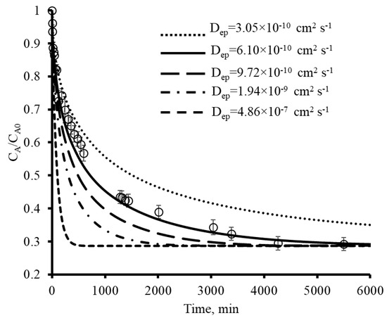 As an example, Figure 9 shows the experimental data for Exp. 1 with the prediction of the diffusional model using different values of Dep. This figure indicates that the prediction of the model is highly influenced by the value of Dep. For instance, for values of Dep = 4.86 × 10−7 cm2 s, the model predicts an adsorption rate almost ten times faster than those obtained experimentally, indicating that smaller values of Depλ are necessary for improving the prediction of the experimental data. After performing an optimization process, the best value of Dep that matched the experimental data was Dep = 6.10 × 10−10 cm2 s−1, whose prediction (solid line) is illustrated in Figure 9.
