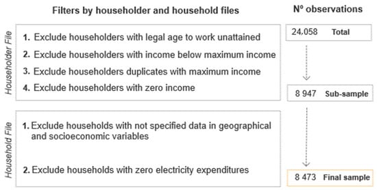 This information is organized into Household and the Household Members files. Within these files, information is grouped into basic variables at household level, which relate to identification, weighting and demographic characteristics of the households’ income and consumption expenditure data [46]. Similarly, basic variables at household member level account for: identification and weighting; gender, age, marital status, country of birth; education level, activity status and income [46]. The sample size for 2010 HBS edition included a total of N = 9489 household units and N = 24,383 householders in Portugal. This original sample underwent a filtering process, in order to promote a match between households as a whole and householders, based on the household reference person (HRP) concept as well as to exclude missing data. The exclusion criteria followed is illustrated in Figure 1.