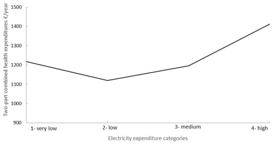 The analysis of all age groups presents higher health expenditures than the reference age level (15–20) (15–29 years old). People over 60 (≥60) from low and medium electricity expenditure categories experience a decrease in health expenditure, in comparison to very low electricity expenditure, as illustrated in Figure 4. Low and medium electricity expenditure categories experience a decrease in health expenditure, in comparison to very low electricity expenditure, across all age ranges. However, this difference is particularly remarkable for people over 60 (≥60) years old for who the difference in health expenditures to reference level amounts to −110 €/year. It should also be noticed in Figure 4, that people over 60 (≥60) with very low electricity expenditure are estimated to have heath expenditures almost as high as the highest electricity expenditure groups (1400 €/year for the former versus 1600 €/year for the latter).