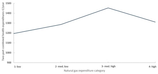 The stronger contribution of logit model (part 1) in comparison to GLM model (part 2) for two-part combined estimate for health expenditure is also noticeable for natural and bottled gas (both with higher positive and significant coefficients). According to Figure 3, health expenditures tend to increase with increasing levels of natural gas expenditure (from level 1 to level 3) and then suffer an abrupt decrease at higher levels of expenditure (from level 3 to level 4). The estimated overall health expenditures reaches about 1450 €/year for people included in level 3 and drops about 150 € in comparison to the reference level (level 1), as illustrated in Figure 3.