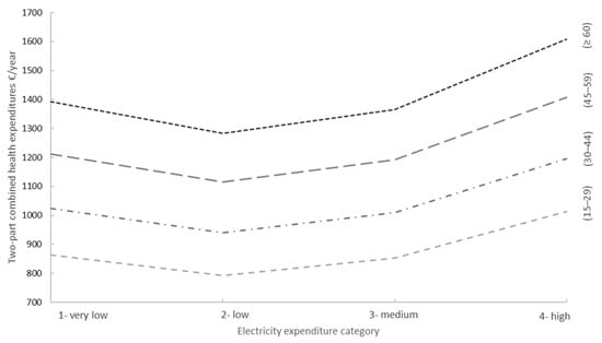 In Figure 4, average adjusted predictions (AAP) for electricity expenditure by each age range shows the incremental effect of age. In comparison to people of lower age ranges, people over 60 (≥60) are associated with higher electricity expenditures and higher health expenditures. For instance, for the low (2) electricity expenditure category, the estimated overall health expenditure is 800 €/year for people between 15 and 29 (15–29) and increases to over 1200 €/year for people over 60 (≥60). These results are plausible since, as one of the most vulnerable segments of the population, the elderly tend to incur increased health expenditures. Also, given their need to keep warm at home, they have been known to increase energy expenditures [74,75].