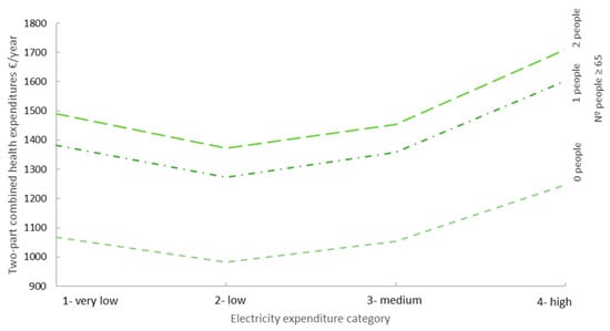 A similar interpretation is required for the increasing number of people above 65 living in the same house, i.e., they tend to increase health expenditures. Although for each electricity expenditure category, the higher number of people above 65 tends to lead to a higher health expenditure in Figure 5, low and medium electricity expenditure categories tend to have lower health expenditures in comparison to very low electricity expenditure.