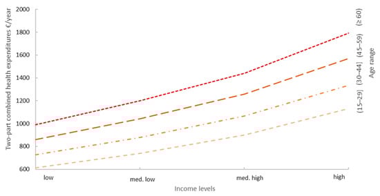 As illustrated in Table 3, there are highly significant explanatory variables for having health expenditures, among all the categories featured in the model, i.e., geographic, socioeconomic and energy expenditure. However, given that the main focus of the current study is to better understand the role of energy expenditures as an explanatory variable for health, other significant explanatory variables are focused on, taking into consideration their relationship with energy and particularly with electricity expenditures. The use of adjusted predictions and marginal effects is required to graphically illustrate how health expenditures change according to age range or income level and electricity expenditure, within the energy expenditure category. Average adjusted predictions (AAPs) are used to visually translate the association between the dependent variable and a given independent variable as the predicted estimate, while all other variables are left at their observed values [72]. They are used to improve the perception of the outcome of the two-part model, since the coefficients in both parts of the model are difficult to interpret, based only on the sign and statistical significance.