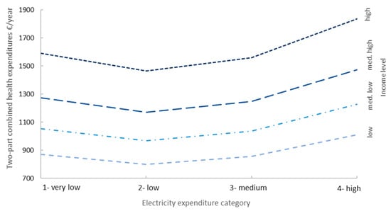 As for the relationship between health, income and electricity expenditures, the Figures show that at each income level the category of very low (1) electricity expenditures presents higher health expenditures than low (2) electricity expenditures and at the same level of medium (3) electricity expenditures. For instance, at the low-income level, the value of health expenditures decreases by 70 €/year for low electricity expenditure in comparison to very low electricity expenditure (reference level).
