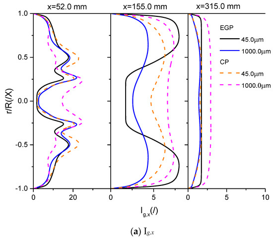 Figure 12 shows the effects of particle Stokes numbers on the Reynolds shear stresses, which exhibit the significantly anisotropic behaviors. At shear flow regions with a larger velocity gradient, the axial–axial normal stresses are larger than those of axial–radial and radial–tangential correlations. At the (x,r) section of 50.4 mm and 93.0 mm, the maximum value is generated, and it subsequently begins to decrease toward the central and boundary primary jetting regions. Values at the inlet region are larger than at the development flow regions because Copper particles readily penetrate central regions. However, EGPs with negative velocity can quickly respond to the reversed flow. Thus, modulation processes are determined by centrifugal forces, turbulent diffusions, and moment transferring between gases and particles. The degree of modulation in the axial–radial direction is larger than those of radial–tangential and axial–tangential directions. Both enhancement and reduction by smaller EGP and larger Copper particles are obtained, respectively. The reason is that the particle accumulation concentration of higher preference is easier to generate at the feebish vorticity regions. Reynolds shear stresses of larger Copper particles are less than those of smaller EGP particles (see Figure 13).