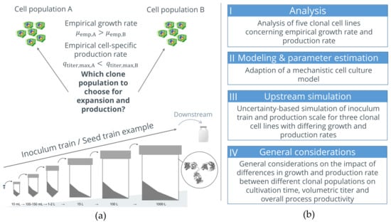 (a) Problem definition: Find the clone with a higher potential regarding inoculum train creation and final quantities of interest (volumetric titer in production and overall process productivity (=Space-Time-Yield; volumetric titer in production/overall cultivation time including inoculum train)). (b) Structure of the presented studies.