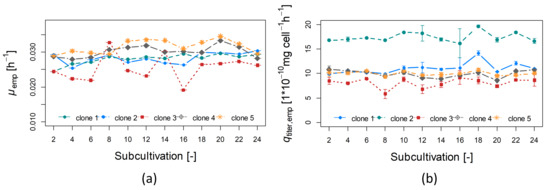 Experimental data from a 3-month stability study were used to calculate growth and production rates for each clonal population. The clonal populations were subcultivated every 3 or 4 days during a time period of 13 weeks (see Section 2.1). The averaged empirical growth rates for two measurements of viable cell density and (at the beginning and at the end of a subcultivation) have been calculated according to Equation (1). The averaged empirical production rate between the beginning of a subcultivation and 4 days later was calculated according to Equation (2) for every second subcultivation (volumetric titer were only determined for the 4-day subcultivations).