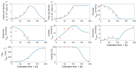 The applied kinetic model is a modification of previous model variations published in [12,13,22,23]. Differential equations (see Table 2), consisting of nine mostly Monod-type algebraic equations (description of growth rate, death rate, substrate uptake, metabolite production kinetics and production rate) and 18 model parameters, describe the cell culture dynamics of total and viable cell density, and and concentrations of glucose , glutamine , limiting substrate , lactate , ammonia and volumetric titer . All these variables and model parameters are listed in Table A1, including units and descriptions.