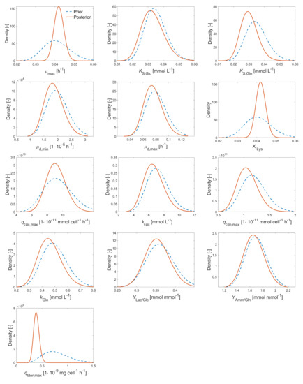 At 500 mL scale, cells have been cultivated over a period of 8 days and substrates (glucose and glutamine) and metabolites (lactate and ammonia) were measured in addition to viable cell density, viability and volumetric titer (to also adapt parameters characterizing substrate uptake and death rate). Based on these experiments, a growth model (see Section 2.2), which had been already applied to other CHO cell lines, was used here while applying Bayesian parameter estimations. This approach consists of the following steps:
