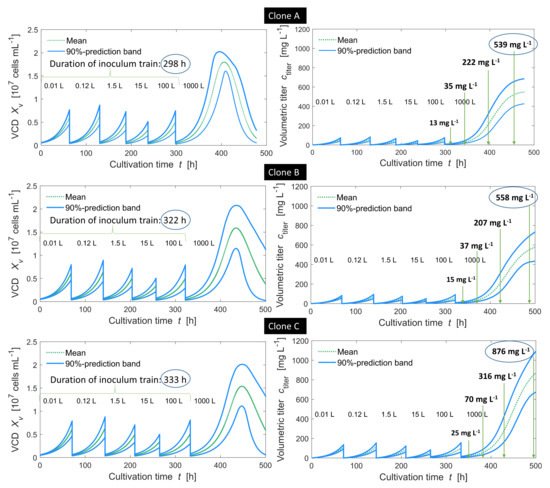 Uncertainty-based simulations of inoculum train and production scale were performed for three clonal cell lines with established differences of growth and production rates.