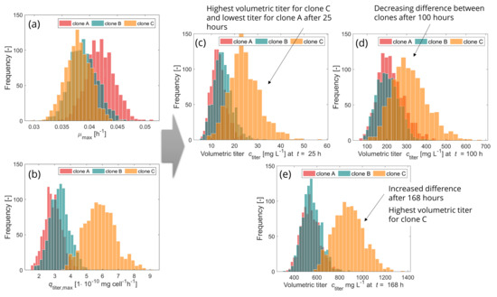 It should be noted that the averaged growth and production rates differ from the model parameters maximum growth rate and maximum production rate , used within a cell culture model. For this reason, the presented findings regarding differences between clonal populations have also been calculated on a percentage basis, to keep the same ratios within the simulation-based investigations. The empirical growth rate of clone 1 was approximately 7.6% higher than that of clone 5 and 10% higher than that of clone 2. The empirical production rate was 10.5% lower than that of clone 5 and 74% higher than that of clone 2.