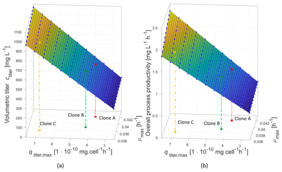 Desired phenotypic parameters to be maintained in such generated cell lines (besides properties characterizing the quality of the produced recombinant protein) are high cell-specific productivity [3,4,8,9] and high growth rates in order to reduce overall cultivation times (including the duration of the cell expansion process). However, growth rates and specific productivity of recombinant cells are often inversely related to each other [3]. Thus, a frequent trade-off has to be weighed between clonal populations, with one showing faster growth but a lower cell-specific production rate and vice versa (see Figure 1a), assuming little or no quality differences in the product obtained.