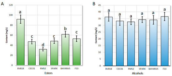 Comparison of the contents of esters (A) and alcohols (B) of the jujube wine produced by the six winemaking yeasts. Bars with different letters on the top (from a to d) indicate that they have a significant difference from each other. The significance of difference between a and b, c, or d is at a level of 0.001 (p value); the significance of difference between b and c or between c and d is at a level of 0.05 (p value); and the significance of difference between b and d is at a level of 0.01 (p value).