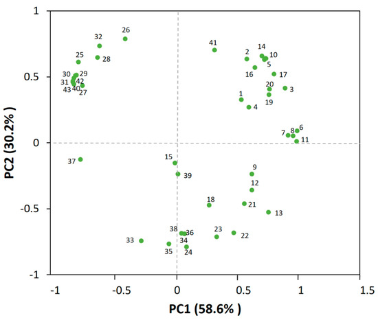 In order to discriminate the volatile profiles, 43 different aroma-active compounds numbered in Table 1 were separated in the biplot (Figure 2), among which the first principal component (PC1) and second principal component (PC2) individually accounted for 58.6% and 30.2% of all variance.