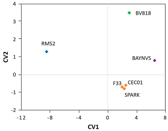 As observed in the CCA plot of aroma (Figure 3), the six samples were separated into four independent clusters that were situated in three quadrants, excluding the third one. The jujube wine fermented by the yeasts CEC01, SPARK, and F33 formed a single cluster that fell in the fourth quadrant of the plot, suggesting that these three yeasts produce wine with a similar aroma profile. The jujube wine samples of BV818 and BAYNVS were distributed in the first quadrant, while the jujube wine by RMS2 was positioned in the second quadrant. These four clusters were far away from each other in the plot, indicating that different yeasts might have great influences on the aroma of the jujube wine [8]. Furthermore, the MANOVA analysis also supported the above observations that there are significant differences in the aroma of the jujube wine fermented by the four clusters of yeasts (p < 0.05), but no significant differences within the cluster of the yeasts CEC01, SPARK, and F33 (p > 0.05). Thus, it is necessary to select the optimal starter culture before the production of jujube wine at a larger scale [22,23].