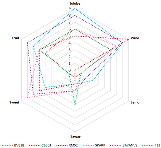 To provide a more visual comparison of the aroma of the jujube wine fermented by the six yeasts, a radar plot was generated on the basis of sensory profiles (Figure 4). Generally, all the six types of jujube wine had higher scores of jujube, wine, sweet, and fruit flavors; but had lower scores of flower or lemon flavor. Among the six types of jujube wine, the wine produced by BV818 exhibited the strongest jujube flavor and had the best sensory quality. In contrast, the wine of BAYNAVS was characterized by the fruit flavor and also showed better scores of other flavors. Therefore, its overall flavor quality was just next to that of the wine produced by BV818. Besides, the yeast SPARK produced the jujube wine characterized by the sweet flavor. However, the wine produced by RMS2 had the strongest wine flavor due to the highest ratio of the contents of total alcohols and esters [21,24,25]. Additionally, it had relatively lower scores for other flavors, resulting in the poorest flavor quality compared with other types of jujube wine.