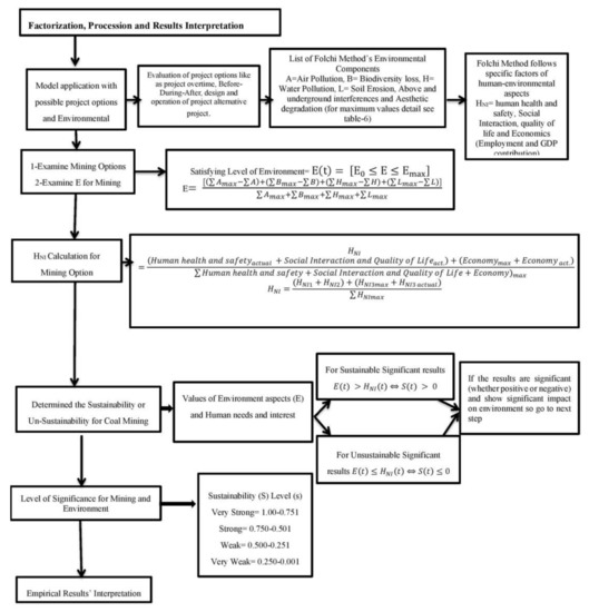 The coal mining environment and factors affecting it are listed as presented in Table 1. The first column consists of coal mining environment categories, and the second column contains coal mining impacting factors. As per mining operation, all possible environmental factors are covered in it. In Figure 4, the Folchi method’s step-by-step process is presented for a quick process visual.