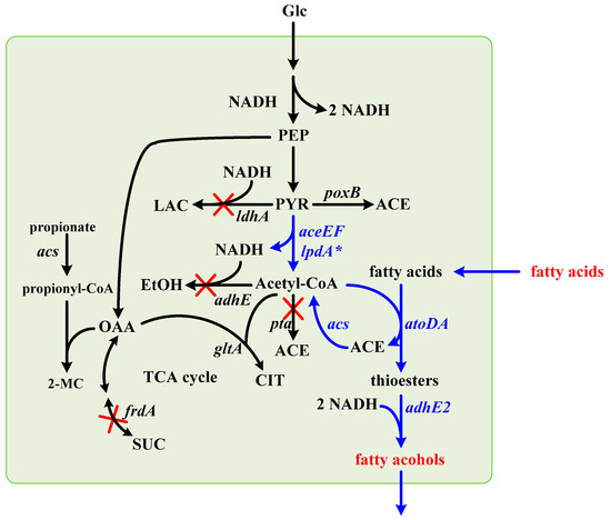 The biocatalytic pathway leading to fatty alcohols in E. coli. The biocatalytic pathway leading to fatty alcohols from short-chain fatty acids was introduced into E. coli by metabolic engineering. Undesired pathways were blocked by deletion of responsible genes as marked by “X”. The genes involved in the metabolic pathway: aceEF-lpdA*: pyruvate dehydrogenase complex; acs, acetyl-CoA synthetase; adhE, aldehyde-alcohol dehydrogenase; adhE2, butyraldehyde-butanol dehydrogenase; atoDA, acetoacetyl-CoA transferase; ldhA, lactate dehydrogenase; frdA, subunit of fumarate reductase; gltA, citrate synthase; poxB, pyruvate oxidase; pta, phosphate acetyltransferase. Abbreviations: ACE, acetate; CIT, citrate; EtOH, ethanol; Glc, glucose; LAC, lactate; OAA, oxaloacetate; PEP, phosphoenolpyruvate; PYR, pyruvate; SUC, succinate; 2-MC, 2-methylcitrate.