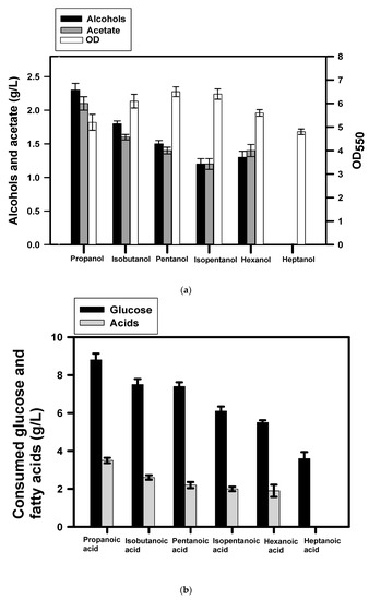 Production of short-chain alcohols in engineered E. coli. The fermentation was conducted with BuT-3E strain in the presence of glucose (10 g/L) and short-chain fatty acids (4 g/L) as indicated for 24 h. The experiments were conducted in triplicate. The fermentation products and the cell density (OD550) were determined at the end of the fermentation (a). The consumption of glucose and fatty acids were measured for further analyses (b).