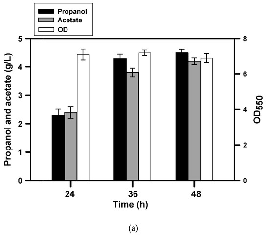 Acetic acid appears to be an associated product in the synthetic pathway of fatty alcohols in the strain. However, it disables the growth of E. coli at a low level and imparts an inhibitory effect on methionine biosynthesis [19]. Acetyl-CoA synthetase (encoded by acs) activates acetate to acetyl-CoA at the expense of ATP and plays a physiological role in scavenging acetate under the anaerobic condition [20]. It also involves in the 2-methylcitrate (2-MC) cycle for oxidation of propionate and produce propionyl-CoA from propionate [21]. In addition, pyruvate oxidase (encoded by poxB) catalyzes oxidative decarboxylation of pyruvate to acetate. Therefore, the expression of acs and aceEF operon were enhanced to improve the fermentation performance of the strain. The increased activity of pyruvate dehydrogenase (encoded by aceEF) directs pyruvate to acetyl-CoA and away from the poxB pathway. The recruitment of ACS facilitates re-utilization of acetate. The resulting strain was designated as BuT-3EP. The substrate-feeding mode was then performed with BuT-3EP strain. As a consequence, the strain consumed propionic acid of 7.4 g/L and produced 1-propanol of 5.4 g/L at 36 h (Figure 4a,b). The conversion yield based on propionic acid accounts for 90% of the theoretical yield. The production of acetic acid reduced to 2.4 g/L from 4 g/L (i.e., BuT-3E strain in Figure 3a) at the end. Nevertheless, the bacterial growth was arrested and not further improved by the supplement of extra glucose. It is likely that the toxicity of acetic acid in part limits the strain’s growth. Moreover, the combined function of AtoDA and ACS is expected to raise the propionyl-CoA level, which likely perturbs the CoA homeostasis and increases the production of 2-MC via the 2-MC pathway. 2-MC is known to be a potent inhibitor of citrate synthase in the tricarboxylic acid (TCA) cycle [22].