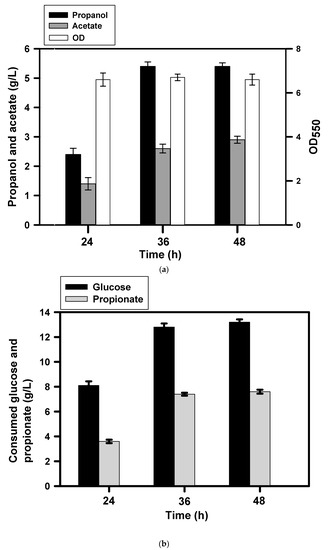 Production of 1-propanol by the approach of substrate feeding. The fermentation of BuT-3E strain was carried out with glucose (10 g/L) and propionate (4 g/L). At 24 h, the substrate containing glucose (10 g/L) and propionate (4 g/L) was added to the culture medium and the fermentation result was analyzed at a predetermined interval. The experiment was conducted in triplicate. The fermentation products and the cell density (OD550) were determined at the end of the fermentation (a). The consumption of glucose and fatty acids were measured for further analyses (b).