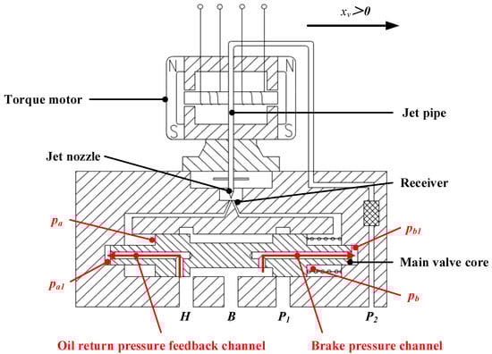 As shown in Figure 1, the working principle of TSBPSV is as follows: When the torque motor does not receive the current signal, the jet pipe does not deflect. Therefore, the flow of the jet nozzle enters the left and right holes of the receiver, and the control pressure . At the same time, the brake pressure channel and the oil return pressure feedback channel are connected with the oil return port H. That is, the feedback pressure on both sides of the main valve spool . The right spring makes the main spool at the leftmost. At this time, the brake port B is connected with the oil return port H.