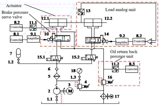 The hydraulic principle of the TSBPSV testing system is shown in Figure 2. The hydraulic cylinder 12.1 on the left is connected with the pressure servo valve 10 through the hydraulic hose as the actuator in the system. The pressure sensor 11.1 is used to collect the output pressure of the pressure servo valve and transfer it to the controller. The hydraulic cylinder 12.2 on the right, force sensor 13, servo valve 14, controller 8.2 and amplifier 9.2 jointly constitute the electro-hydraulic load simulator. Due to the presence of the force sensor, the precise control of the load can be realized. The two-position three-way directional control valves 15.1 and 15.2 are used to control the on-off of the brake pressure servo valve and the oil circuit of the load simulation unit, respectively. The accumulator 7 and the normally open globe valve 1.2 form a pressure regulating module to stabilize the pressure pulsation from the hydraulic oil source. Oil return relief valve 16, pressure sensor 11.2 and controller 8.3 form the oil return back pressure unit, which is used to set the back pressure of the system and transmit the real-time data of oil return back pressure to controller. The flood valve 4, normally open stop valve 1.3 and pressure gauge 18 are used to set the outlet pressure of the hydraulic pump. High pressure fine filter 5 is installed at the pump port to clean the oil. Servo motor 3 drives axial piston quantitative pump 2 to provide oil source. Air cooler 17 is used to cool oil.