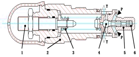 DBD type direct-acting relief valve insert body structure is shown in Figure 4. It is mainly composed of pressure regulating element 1, valve sleeve 2, spring 3 and conical spool 4, the pressure of the system can be set with the help of the pressure regulating element. Its working principle is as follows: spring 3 presses conical spool 4 on the seat, channel P is connected to the H port of the brake pressure servo valve through the pipeline., The oil return pressure of the system acts on the cavity 6 at the bottom of the valve core through the internal damping hole to form a static pressure opposite to the spring force. If the value exceeds the set value of the spring, the spool 4 overcomes the spring force and opens. Among them, the stroke of the spool is limited by the limit slot 5.