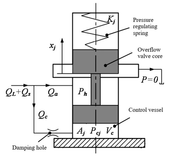 where, refers to control pressure change of relief valve (Pa/s); is the flow area of the relief valve port (m2)); is the flow coefficient of the relief valve; is the displacement of the spool of the relief valve (m); is the overflow valve flow (m3/s).