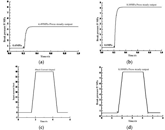 For the pressure servo valve, there are two common working conditions: step response and slope response. In this paper, the step response and slope response of brake pressure are used to evaluate the dynamic characteristics of the pressure servo valve. Given the 20 mA step current signal and 40 mA step current signal, the output response curves are shown in Figure 8a,b. Given the 40 mA ramp current signal shown in Figure 8c, the output response curve is obtained as shown in Figure 8d.