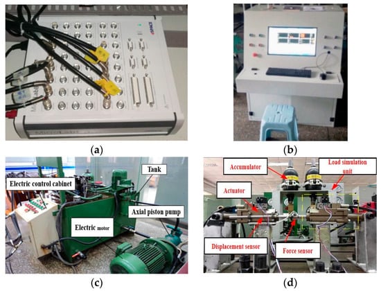 Test Platform for Load Simulation Performance of Braking Pressure Servo Valve-Controlled Cylinder System. (a) dSPACE controller. (b) Electric control cabinet. (c) Experimental station. (d) Experimental system organization.