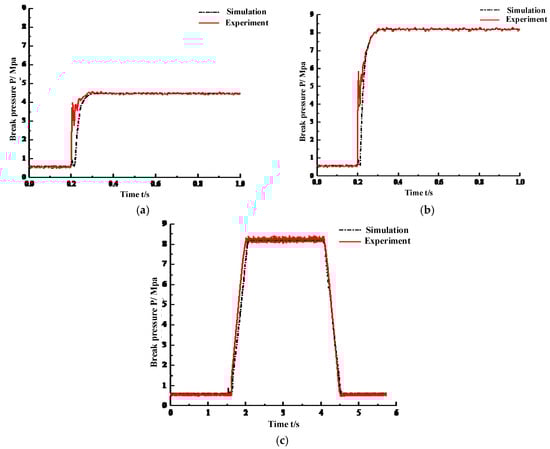 It can be seen that the simulation results of the pressure servo valve are in good agreement with the experimental results in terms of brake pressure stability, rise time, overshoot and steady-state error. The establishment process of the load pressure of the jet nozzle in the simulation analysis is different from that in practice because of the comprehensive characteristic equation of the jet nozzle that is used in the simulation analysis model. This is the reason for the step of the simulation curve when t = 1.5. This leads to a certain error between the simulation results and the experimental results in the rising section of brake pressure.