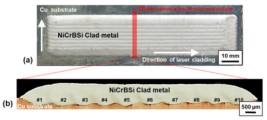 In this study, a NiCrBSi-based Metco-12C (Oerlikon®) commercial alloy was used as the powder material for laser cladding, and pure Cu was used as the substrate. The chemical composition of the cladding powder was 7.5 wt.% Cr, 3.5 wt.% Si, 2.5 wt.% Fe, 1.7 wt.% B, 0.25 wt.% C, and the balance of Ni.