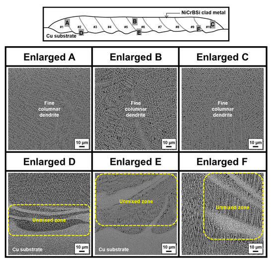 Figure 2 shows the representative (a) surface appearance and (b) cross-sectional macrostructure after 10 passes of NiCrBSi laser clads on a Cu substrate. The overall dimensions of the clad metal at surface appearance were 110 × 25 mm2. The ratio of dilution with the Cu base metal was approximately 35% based on a single deposit, and sound clad metal was obtained without cracks or pores. Figure 3 shows the microstructure of the clad metal observed by SEM, where each observation area (A–F) is marked on the schematic diagram of the laser clads. Near the surface of the clad metal (images A–C), the fine solidification structure consisted of columnar dendritic morphology. The average primary dendrite arm spacing was 10 μm, and the secondary dendrite arm spacing was ~1 μm. Near the faying surface (images D–F), an unmixed zone between the NiCrBSi alloy and the Cu substrate was clearly observed.
