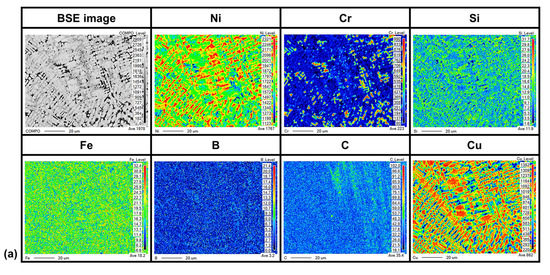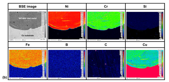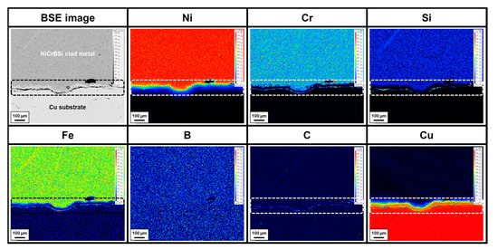 Figure 4 shows the results of EPMA analysis of the as-clad sample (a) near the surface of the clad metal (at region B indicated in Figure 3) and (b) near the faying surface (region E). In the clad metal (Figure 4a), solidification segregation behavior was confirmed for Ni, Cr, and Si, along with Cu. Therefore, the Cu from the substrate was highly diluted during the dissimilar cladding. Near the faying surface (Figure 4b), the unmixing behavior of the alloying elements from the NiCrBSi alloy and the Cu substrate was clearly observed (as shown in Figure 3).