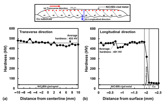 Figure 5 shows the hardness distribution of an as-clad specimen along the (a) transverse and (b) longitudinal directions, where the measurement points and directions are defined in the upper schematic. The hardness tended to slightly decrease from the first pass to the final pass, and the average hardness of the clad metal near the surface was 453 HV (Figure 5a). As shown in Figure 5b, a similar average hardness value (451 HV) was confirmed in the longitudinal direction within the clad metal; however, the hardness drastically decreased to 55 HV, which is the hardness of the soft pure Cu substrate. Therefore, the slight decrease in hardness with additional cladding passes was probably due to a continuous increase in the degree of dilution of the alloy with Cu.