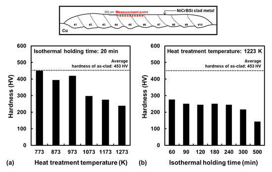 Figure 6 shows the relationship between the heat treatment temperature and the hardness of the clad metal, where the hardness measurement positions are defined in the upper schematic. Each hardness value shown in Figure 6 is the average of 10 measurements. As the heat treatment temperature increased, the hardness of the clad metal continuously decreased compared to average as-clad hardness of 453 HV (Figure 6a). In particular, as the isothermal holding time increased to 500 min at a heat treatment temperature of 1223 K (Figure 6b), the hardness of the clad metal decreased from 275 HV to 142 HV. The hardness of the clad metal near the surface was ~70% of the as-clad hardness.