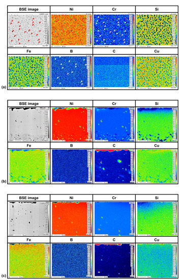 Figure 7 shows EPMA results of the microstructure developed in the samples after post-clad heat treatment at (a) 1073 K for 20 min, (b) 1223 K for 180 min, and (c) 1223 K for 500 min. For the heat-treated clad metal at the 1073 K–20 min condition, a Ni-based matrix phase with secondary phases consisting of Cr-based borides and carbides were clearly confirmed, i.e., the solidification structure with columnar dendrite morphology (displayed in Figure 4a) was changed by the heat treatment. As the heat treatment temperature and time further increased, the microstructure of the clad metal changed, as shown in Figure 7b,c, respectively. Secondary phases formed and were almost dissolved into the matrix phase (Figure 7c), i.e., the solidification microstructure was nearly homogenized during the heat treatment used here. Furthermore, these microstructural variations are thought to be the cause of the drastic decrease in the hardness of the clad metal observed in Figure 6.