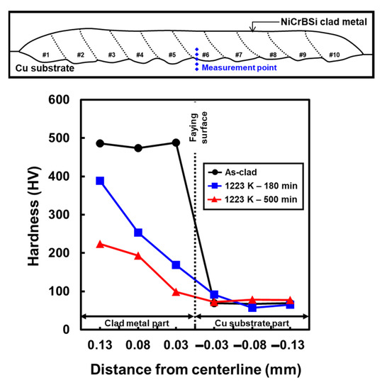 Figure 8 shows a representative hardness distribution around the faying surface between the clad metal and substrate, and its variation after the post-clad heat treatments. The corresponding measurement positions are marked on the upper schematic of the clad metal. For the as-clad specimen, hardness sharply decreased within the transition zone, as also indicated in Figure 5b. Unlike the as-clad specimen, with a sharp decrease in hardness at the transition zone, the hardness decreased smoothly after heat treatment at 1223 K, probably due to the mixing of the alloy and Cu homogenizing the interface, as described by the EPMA microstructure shown in Figure 9. Compared with that of the as-clad specimen (Figure 4b), evidence of solute diffusion behavior was clearly observed after the heat treatment (region marked by the white dashed rectangle in Figure 9). Therefore, the smooth transition zone near the faying surface after the heat treatment could be due to solute diffusion.