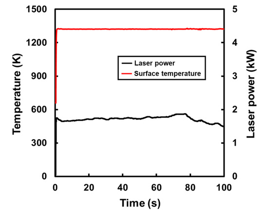 Trends of laser power and surface temperature during laser heat treatment of the clad metal (set temperature at surface: 1323 K).